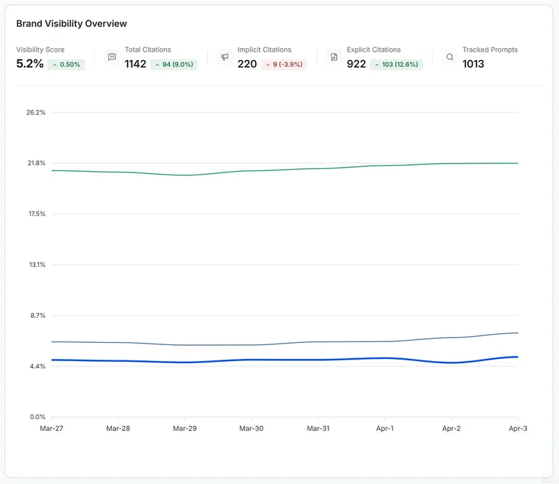 See which prompts mention clients, where competitors appear, and how positioning shifts over time.