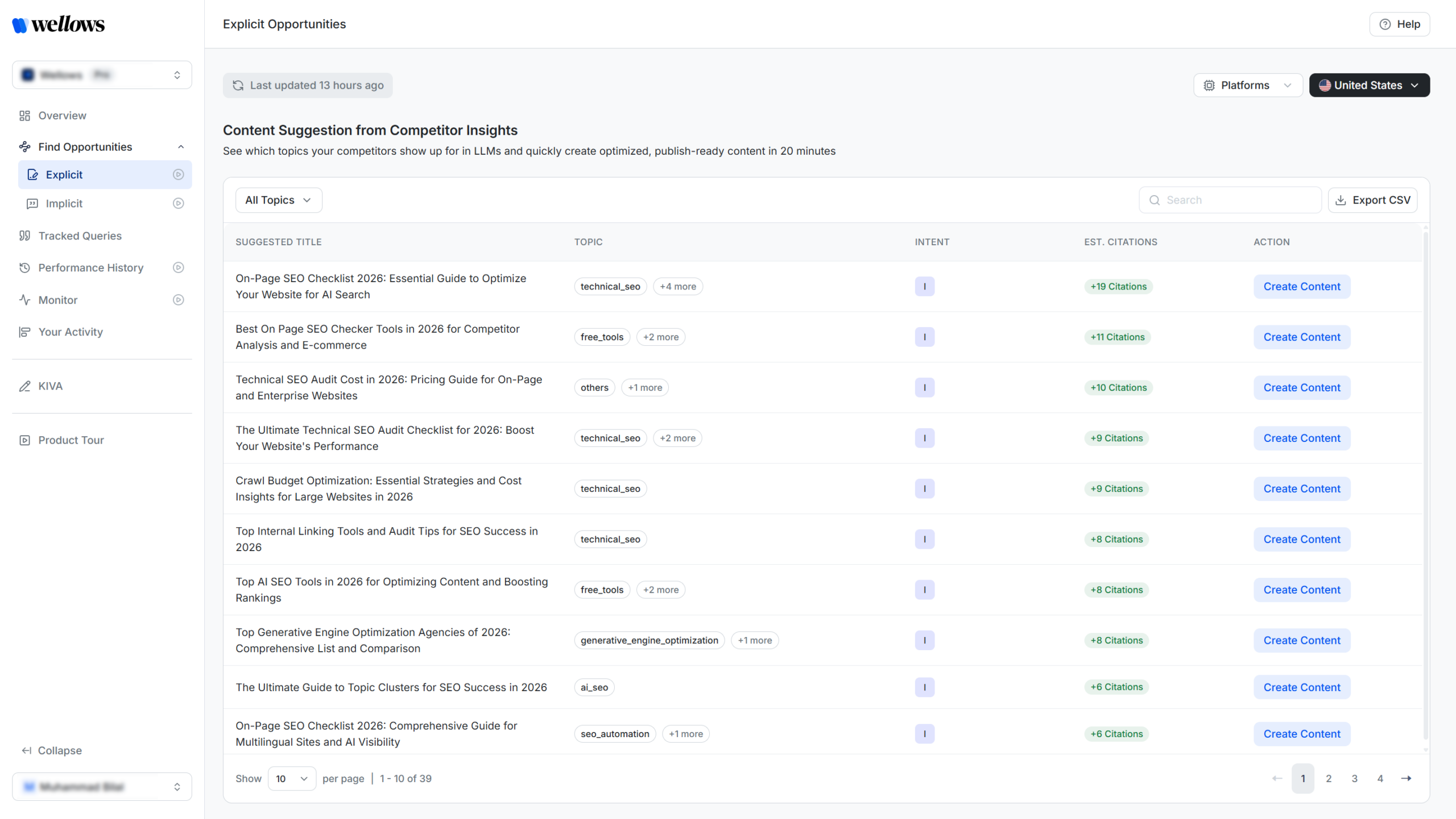 Content Opportunities in Wellows help agencies identify topics where clients can earn AI citations by filling gaps. These are queries where competitors are cited but the client is not.
