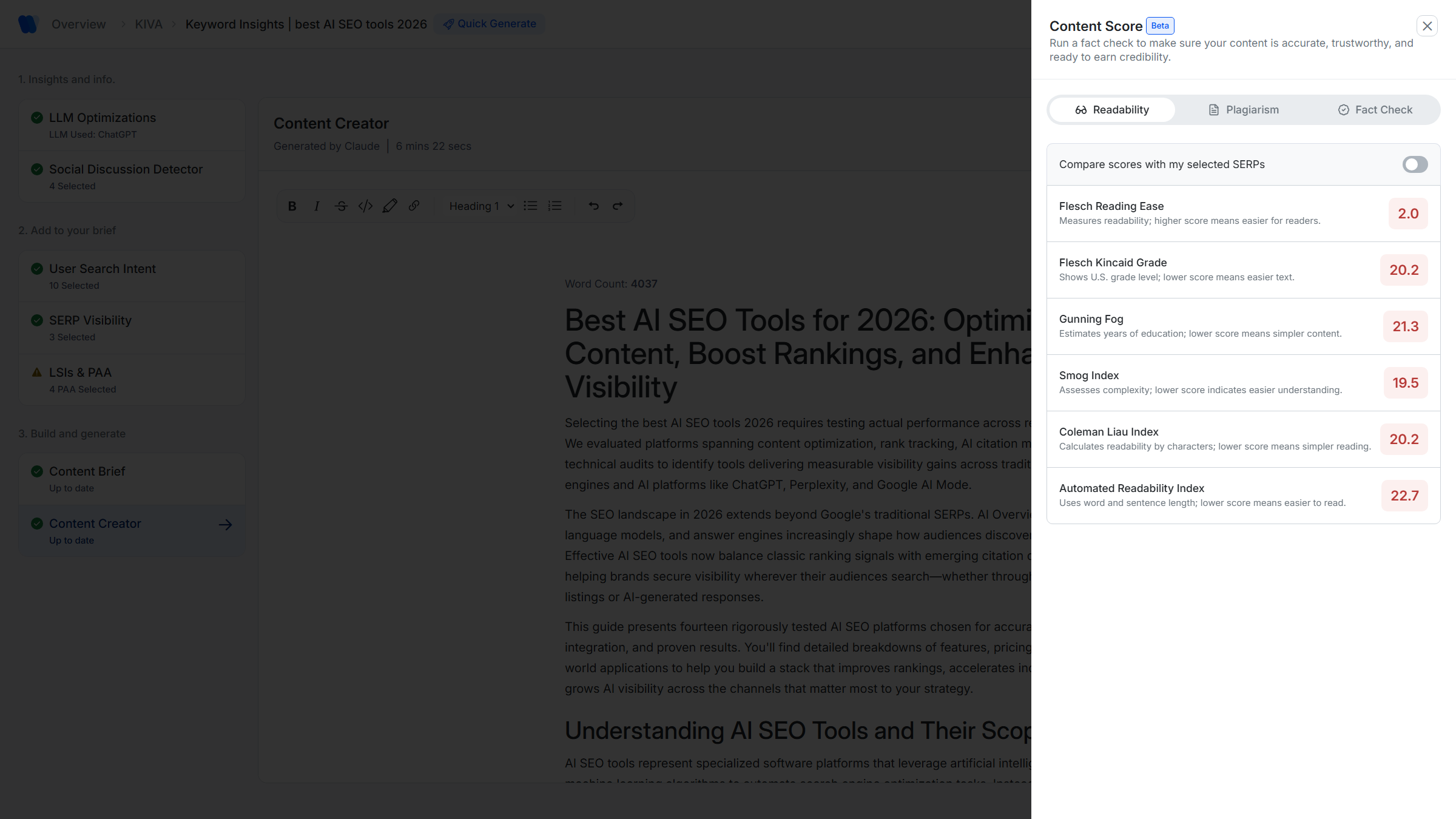 The plagiarism check highlights whether content is original or closely matches existing sources, helping agencies avoid duplication issues.