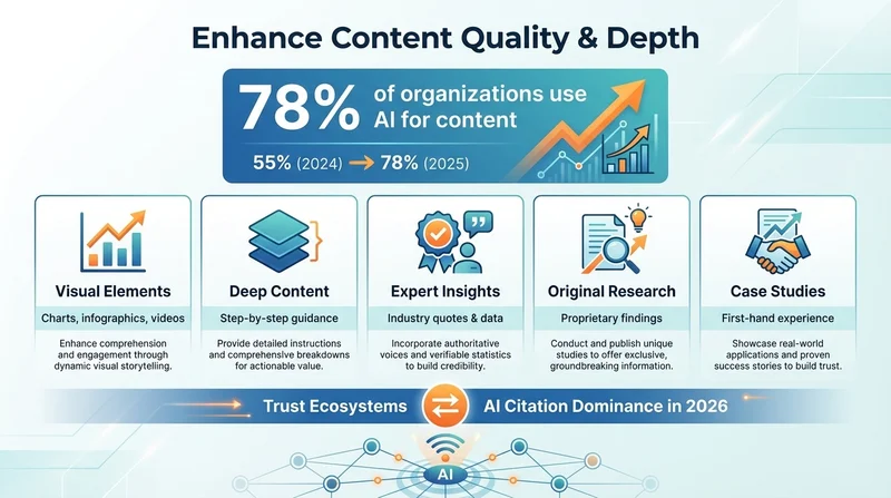 78% of organizations reported using AI for content creation and optimization in 2025, up from 55% the year before. The bar for content quality is rising dramatically.