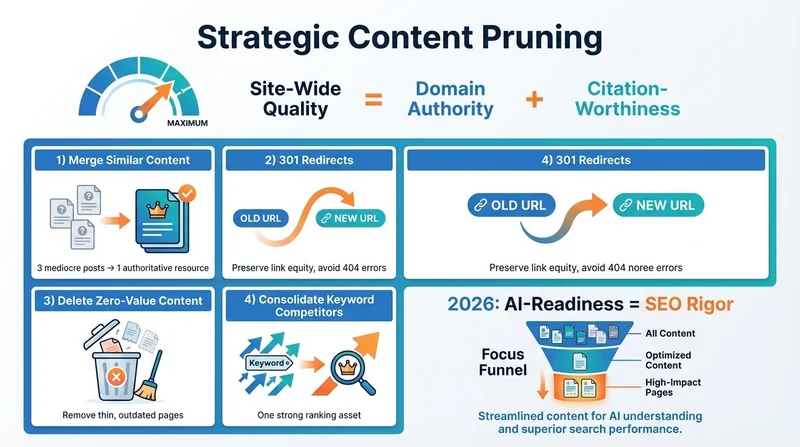 Sometimes the best way to fix content decay is strategic pruning. With AI systems evaluating overall site quality, low-quality pages hurt your entire domain's authority and citation-worthiness.