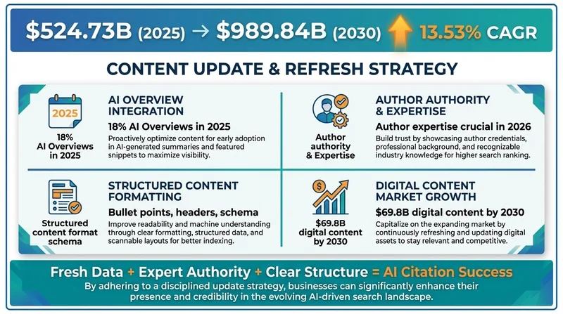 The content marketing market stands at $524.73 billion in 2025 and is projected to reach $989.84 billion by 2030, with a 13.53% CAGR. This explosive growth means competition for visibility is intensifying and fresh, updated content is your competitive advantage.